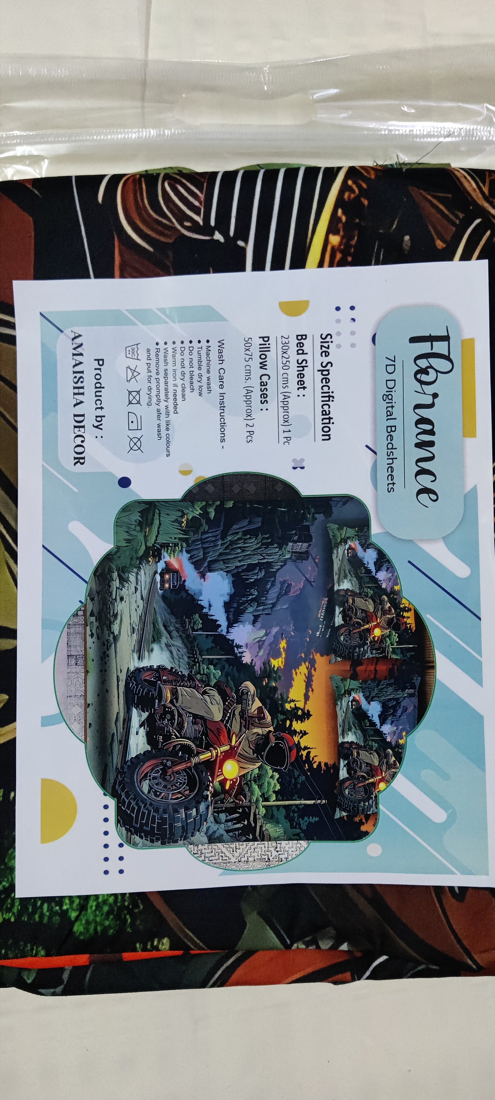 Trendy 7D Florence Hyper Bike Bedsheet featuring a bold bike and adventure-themed design. Made from soft cotton material, this non-elastic queen size bedsheet (90 x 100 inch) adds a dynamic and stylish vibe to your bedroom.