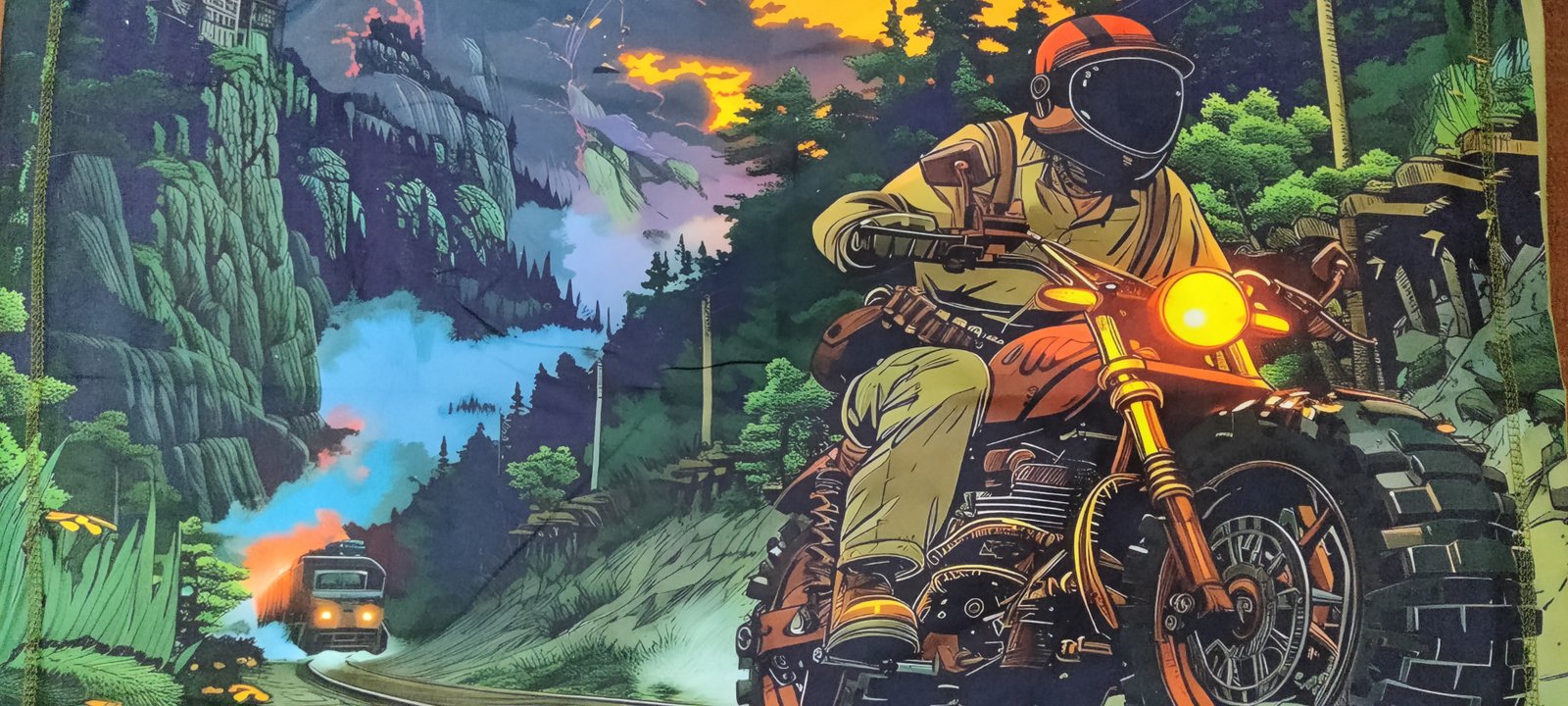 Eye-catching bike and adventure scene with a 7D digital effect creates a bold and energetic look. - 🌄 Adventure-Themed Artwork