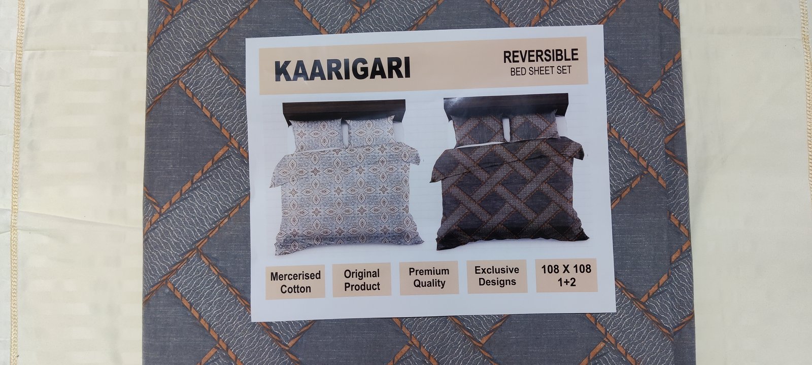 Premium reversible king-size bedsheet made from 100% mercerised cotton, featuring elegant Kaargiri Graygeo design with modern geometric and classic patterns. Soft, breathable, and perfect for a stylish bedroom upgrade.