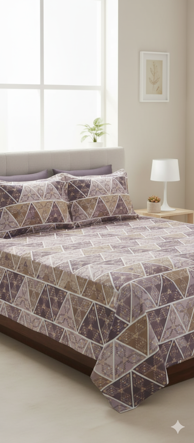 Give your bedroom a modern and elegant makeover with the Sweden Classy Threads Queen Size Geometric Triangle Printed Cotton Bedsheet Set. Made from 100% pure cotton, this bedsheet features a stylish geometric triangle pattern that adds a contemporary and premium touch. The set includes 1 bedsheet and 2 matching pillow covers, perfect for everyday comfort and refined décor.