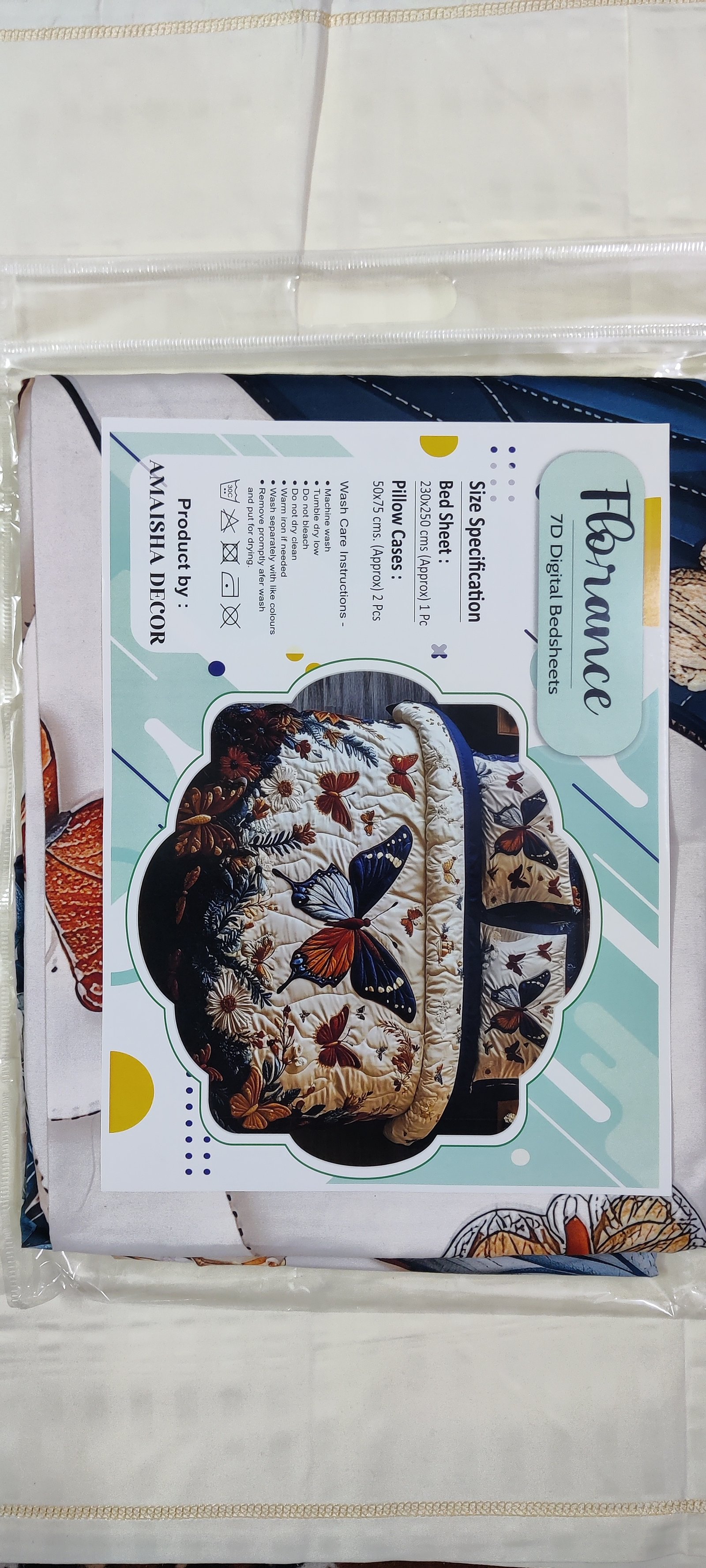 Beautiful 7D Florence Butterfly Bedsheet designed with vibrant butterfly and floral patterns. Made from soft cotton material, this non-elastic queen size bedsheet (90 x 100 inch) adds a fresh, elegant, and lively touch to your bedroom.